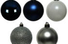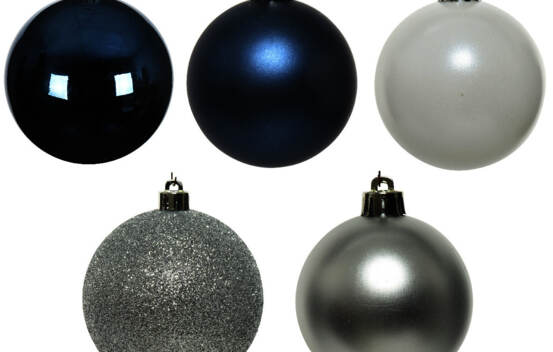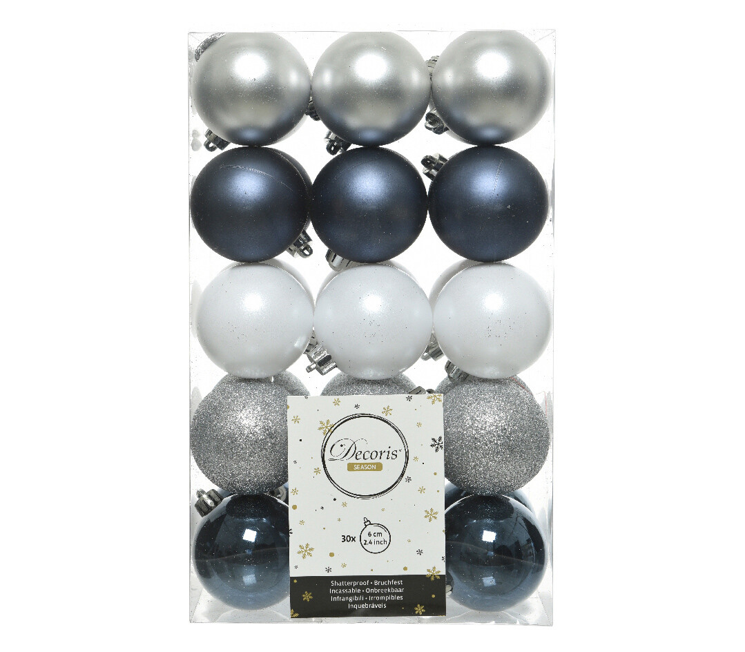 Boule en plastique 6 cm (Billant - Paillettes) (Paquet de 30) Argent - Bleu nuit - Blanc d'hiver