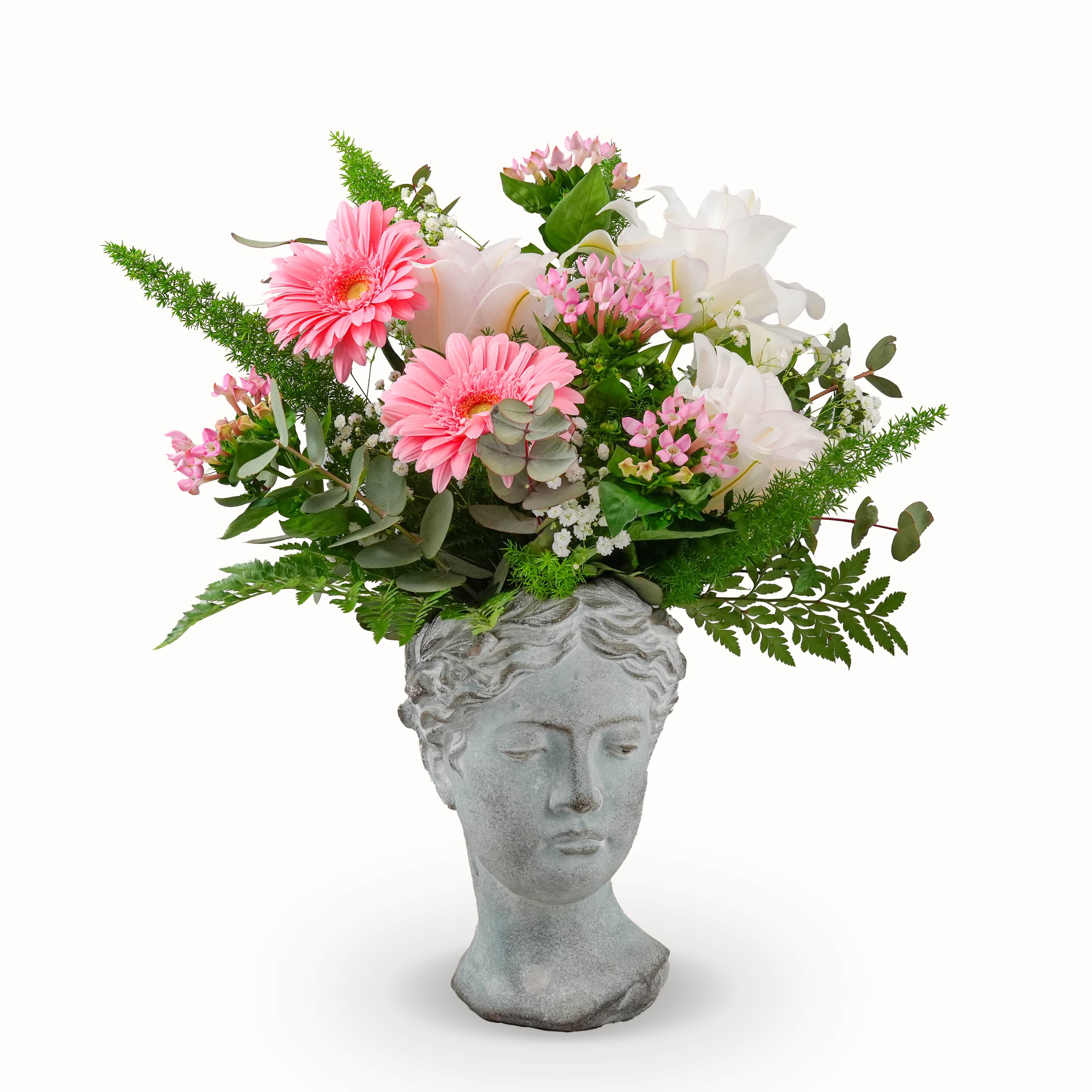 Une composition majestueuse et élégante, inspirée de la reine des déesses pour rendre un hommage plein de dignité et de tendresse. * Vase en béton inclus. Une composition majestueuse et élégante, inspirée de la reine des déesses pour rendre un hommage plein de dignité et de tendresse.
